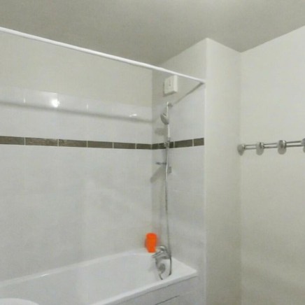 The modern and generously sized bathroom features a bathtub and space for a washing machine. Separate WC.