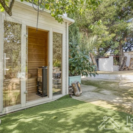 An outdoor barbecue, a garden lounge, and a sauna complete this idyllic setting, ideal for relaxing in both summer and winter.