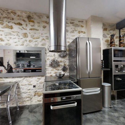 In an industrial style, this property features high-end equipment and materials, combining cut stone, stainless steel, glass, and polished concrete. Two glass floors reveal a large weight room in the basement (possible to convert it into a second bedroom, plan already in place), with a professional treadmill, a large walk-in shower, a sauna, and a light-filled bathtub.