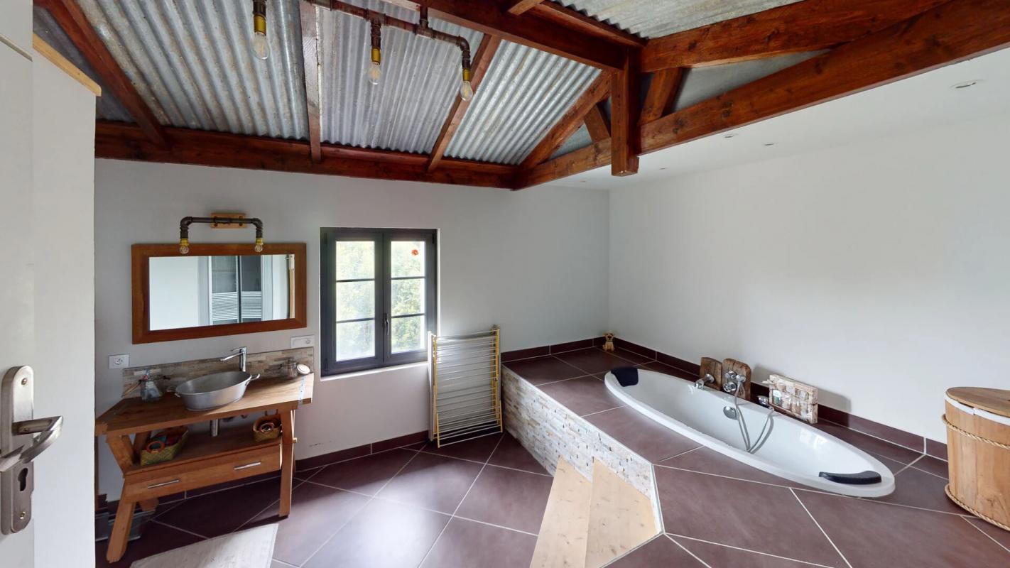 The bathroom, recently updated, features high-quality materials and a modern style.