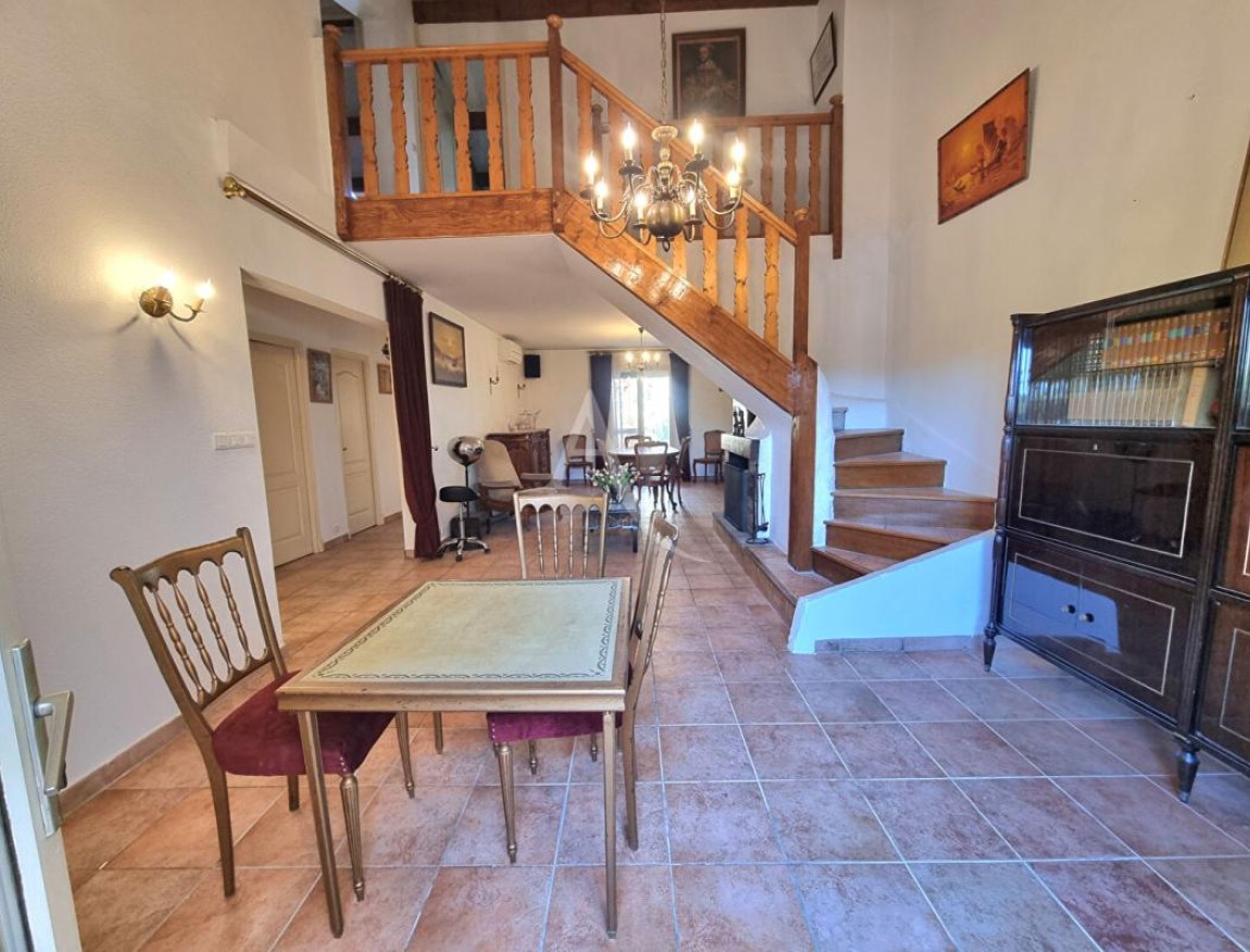Upstairs, there is a 10 m² kitchen and a large, air-conditioned 42 m² living room with high ceilings and exposed beams, opening onto the garden.