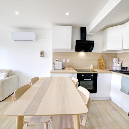 From the entrance, the light and quality of the finishes capture the eye. The air-conditioned living area is organized around a modern, fully equipped open kitchen, where every detail has been designed to combine aesthetics and functionality. The space opens onto a sunny terrace with a pleasant sea view, an ideal setting for savoring each sunrise.