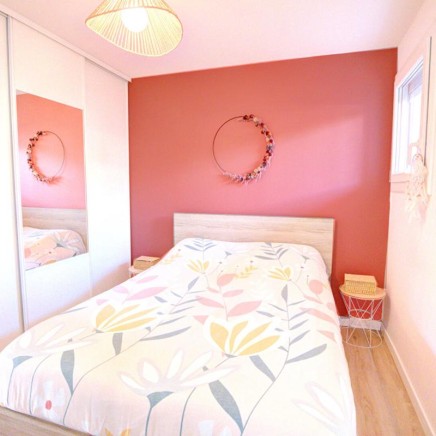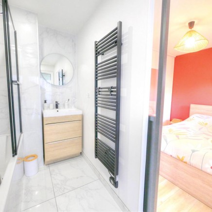 The sleeping area offers a soft and relaxing atmosphere. The bedroom, designed like a cocoon, features a large custom-made closet and opens directly onto a modern bathroom with clean lines. The ensemble forms a truly intimate suite, conducive to relaxation and gentle awakenings.
