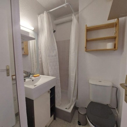 Une entrée avec placard et petit lave-linge (1-3kg) - Une kitchenette avec frigo top, plaque 2 feux, micro-ondes - Un séjour avec canapé BZ, TV , table pliante- Salle d'eau avec WC.