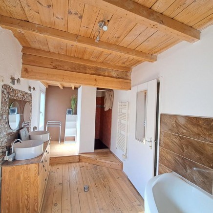 1er étage, 2 chambres dont une avec dressing, une salle de bain avec douche, baignoire d'angle et wc.