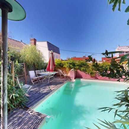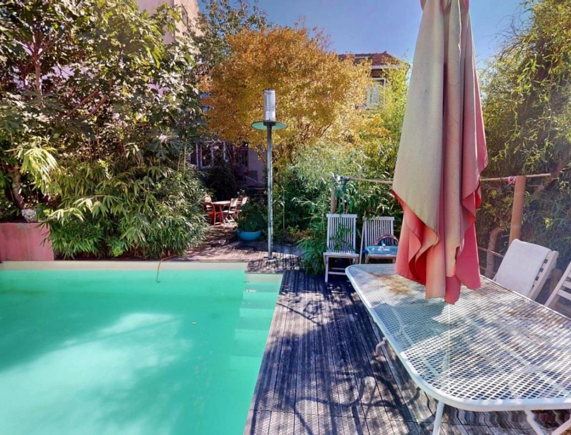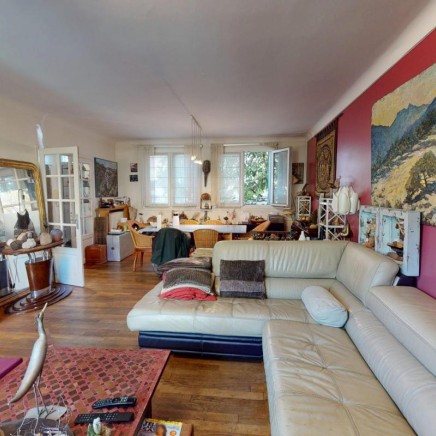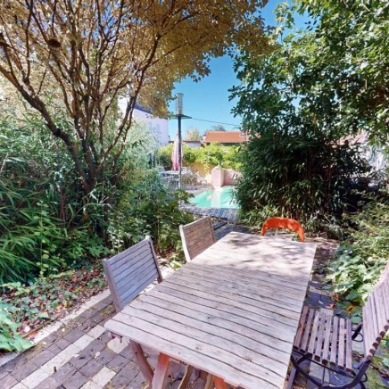 Au RDC, vous trouverez un beau séjour traversant de 32 m², parquet ancien au sol et porte fenêtre donnant sur la terrasse, le jardin arboré et sa piscine chauffée, une cuisine indépendante de 9,2 m² avec accés à la terrasse et un WC.