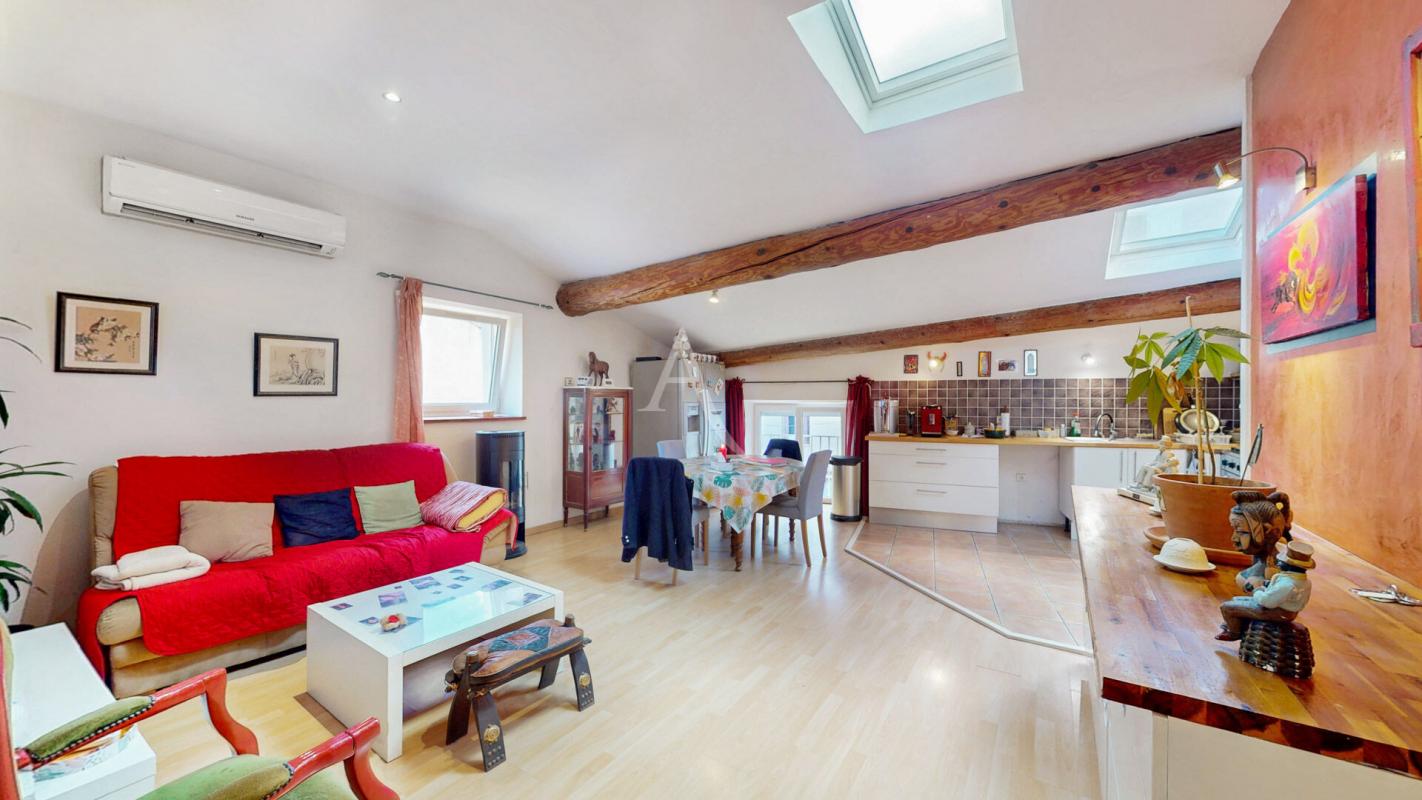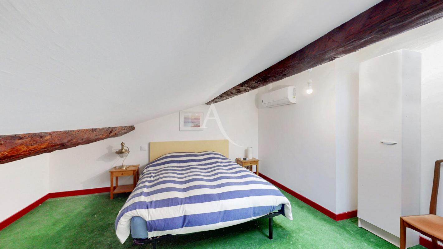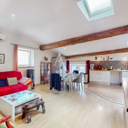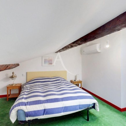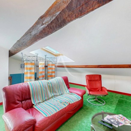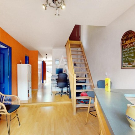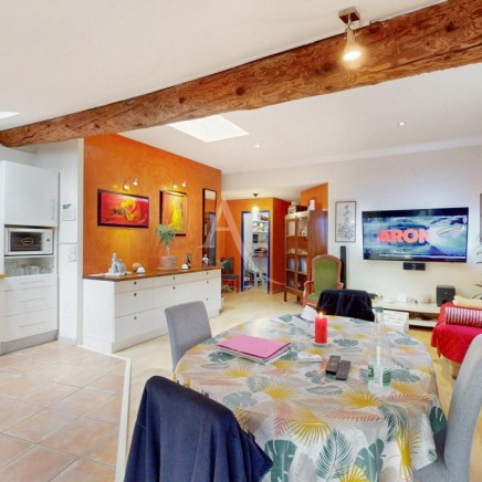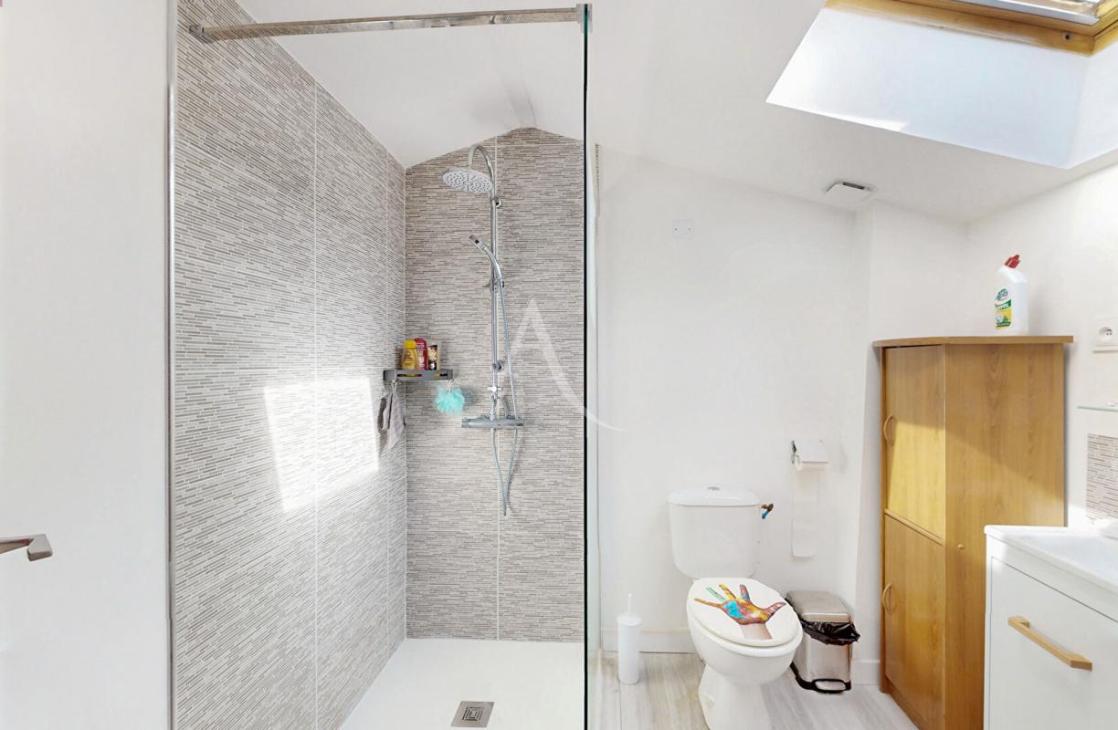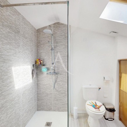 A l'étage, le salon séjour mesurant 40m², un couloir qui conduit à un cellier, 2 chambres (12.94m² et 13.86m²), un WC, une salle d'eau récemment rénovée, un coin petit salon avec l'accès à la terrasse sans vis à vis où il y sera agréable d'y accueillir vos convives.
