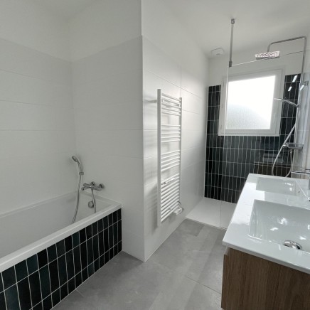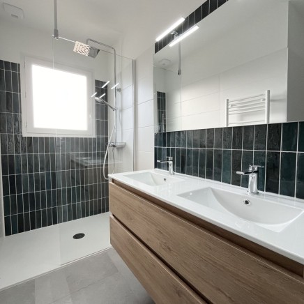 Pour la partie nuit, un dégagement distribue trois belles chambres avec placards ainsi qu'une salle de bains avec double vasque, douche, baignoire et fenêtre.