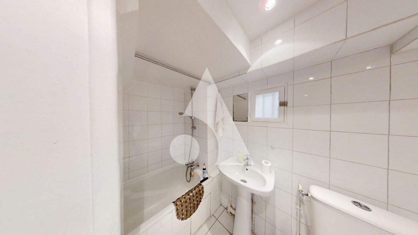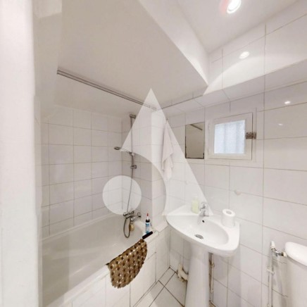 La salle d'eau, compacte mais fonctionnelle, comprend une baignoire, un lavabo et des toilettes, le tout dans un décor épuré aux carreaux blancs. Des rangements intégrés, étagères et colonne, optimisent l'espace.