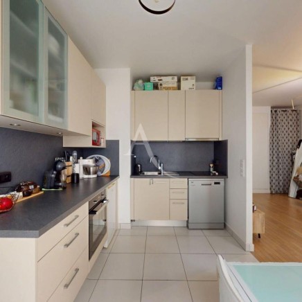 La pièce principale mène à une agréable loggia exposée Sud-Ouest et s'ouvre sur une vaste cuisine dînatoire parfaitement aménagée.