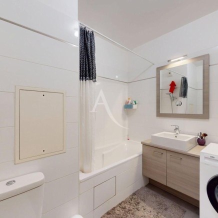 La salle de bains avec WC bénéficie d'un espace buanderie.