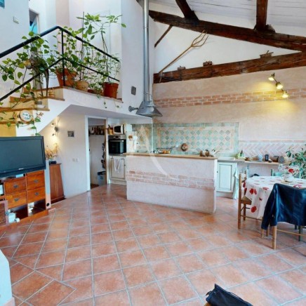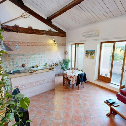 A l'étage principal, le charme opère immédiatement avec une spacieuse pièce de vie climatisée, baignée de lumière avec une hauteur sous plafond d'environ 5 m² , sublimée par une magnifique charpente apparente centenaire, offrant un caractère unique à l'ensemble.