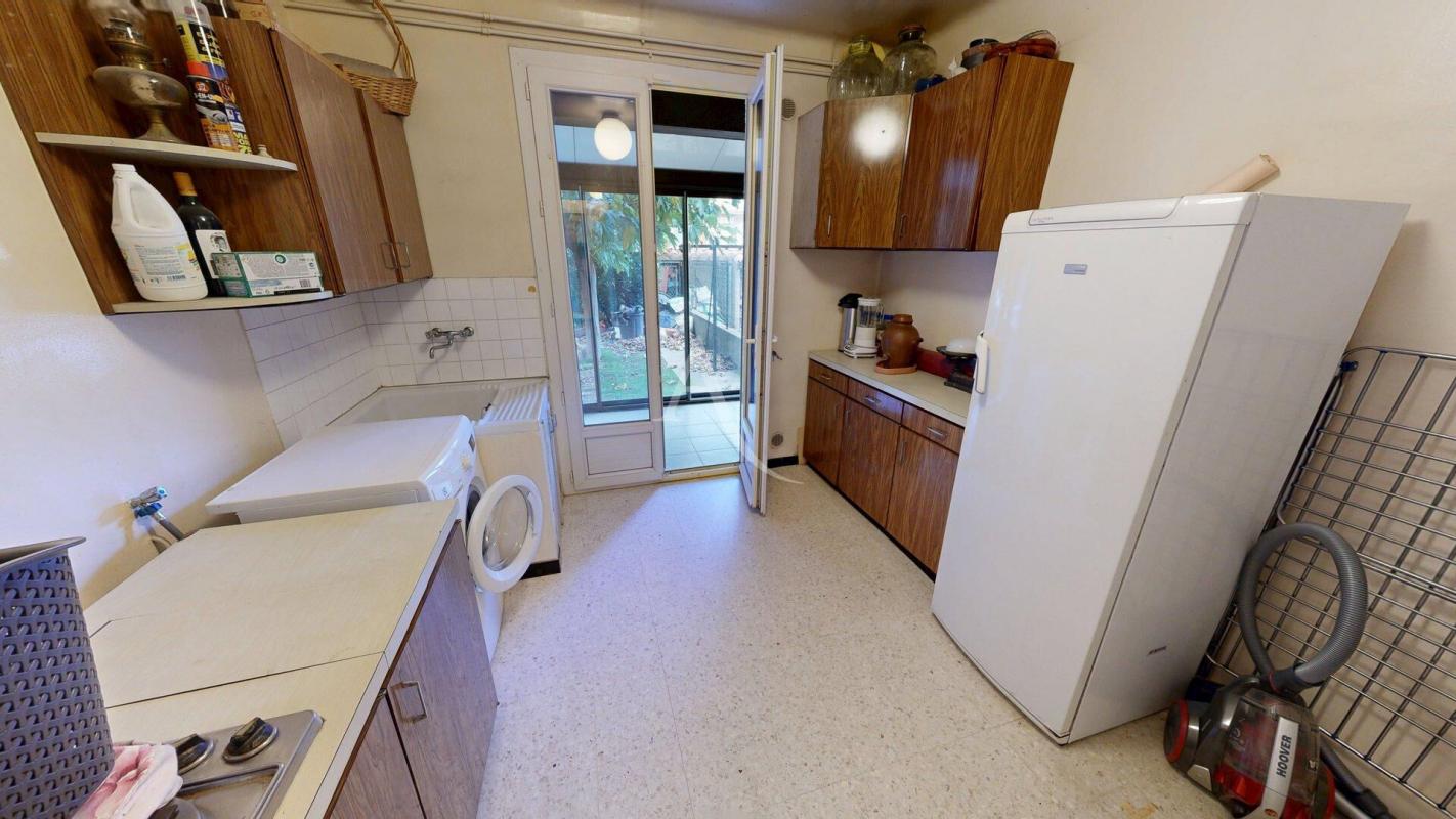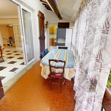La cuisine et le salon climatisé et avec insert donnant sur une agréable véranda de 11 m²