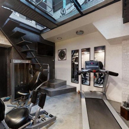 2 planchers de verre laissent apparaître au Sous/sol une grande salle de musculation (possible de la transformer en 2ème chambre, plan déjà prévu), avec son tapis de course professionnel, une grande douche à l'italienne, un sauna et une baignoire lumineuse.