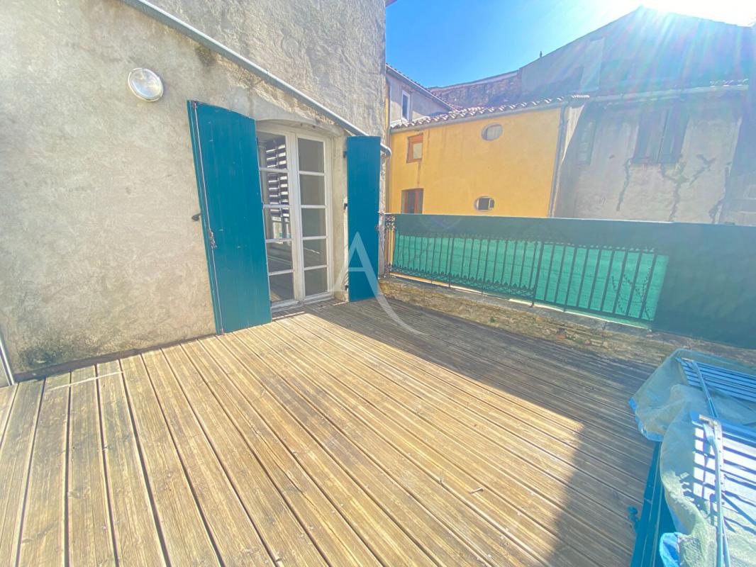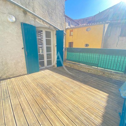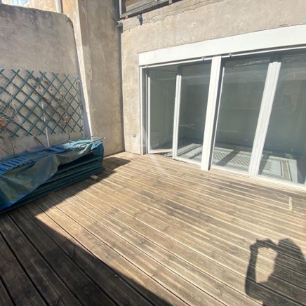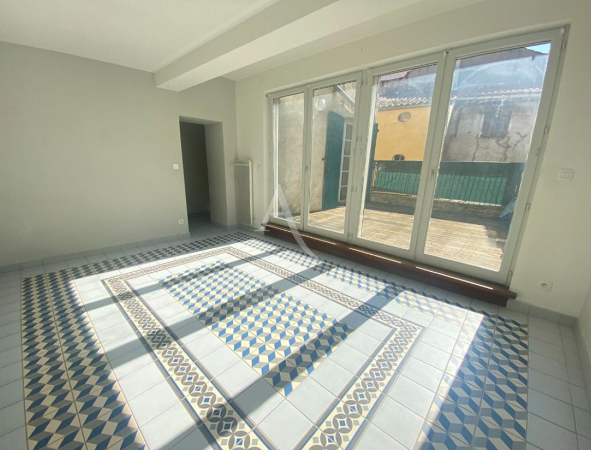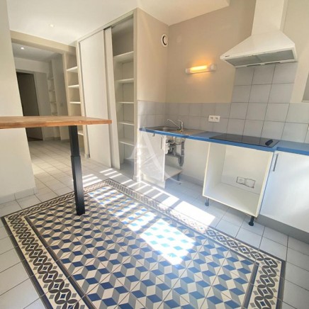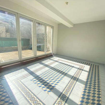 Un premier dégagement dessert la cuisine séparée équipée d'une hotte et d'une plaque de cuisson ainsi qu'un salon lumineux ouvrant tous deux sur une spacieuse terrasse ensoleillée, sans vis-à-vis.