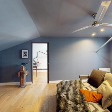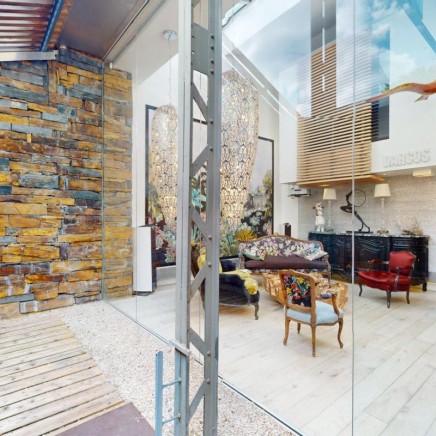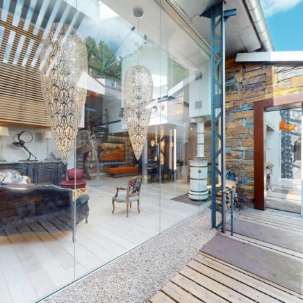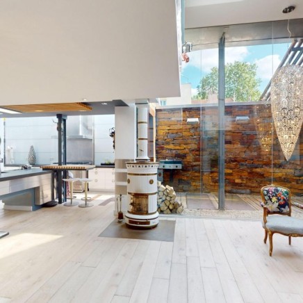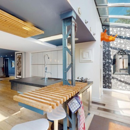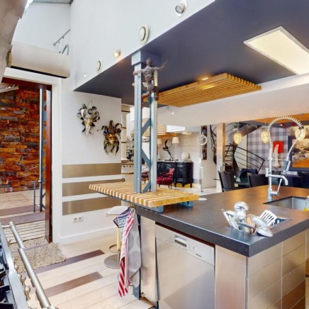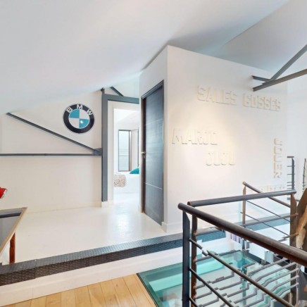 Conçue avec de beaux matériaux (béton, bois, acier, poële en fonte, structure type Eiffel, verrière), cette villa est résolument moderne et très fonctionnelle, avec son entrée sécurisée pour véhicules 2 roues.