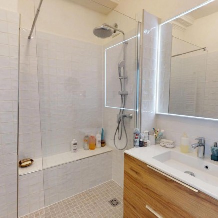 Cet appartement comprend aussi une salle de bains avec douche à l'italienne, un WC indépendant, un dressing, des placards et des rangements intégrés, et, en option pour 15 000 €, une belle cave de 13 m² et d'une hauteur de 2,50 m sous plafond vouté.