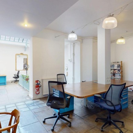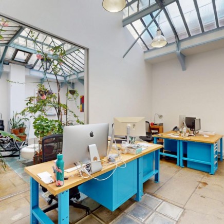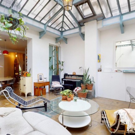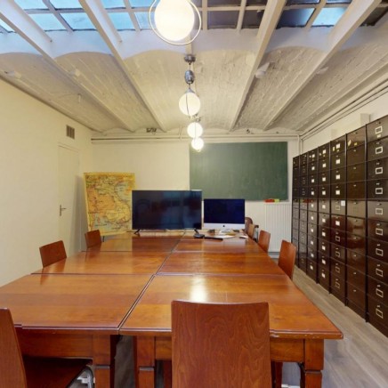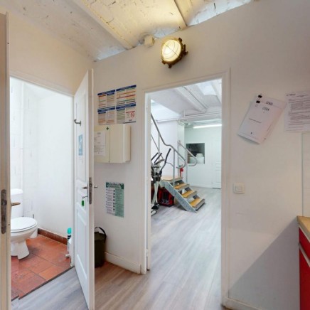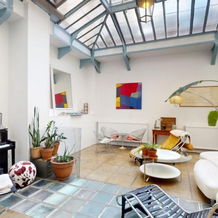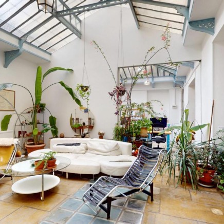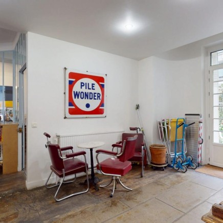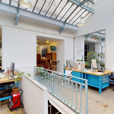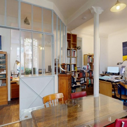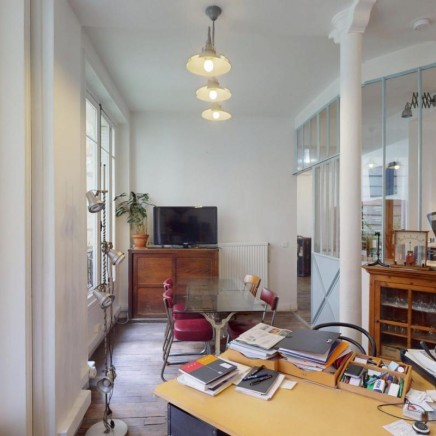 Vous serez séduit par le séjour de 34 m², baigné de lumière grâce à sa superbe verrière Eiffel, sous 5,20 m. de haut, séparé par une grande cloison coulissante, de la partie professionnelle du bien, un open space de 35 m², s'ouvrant sur plusieurs bureaux, en sous-sol ou vers l'entrée, et offrant une vue apaisante sur la jolie cour pavée et fleurie,