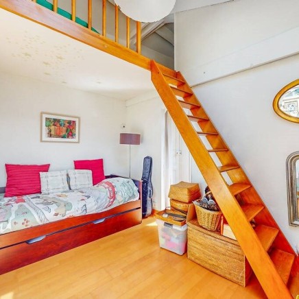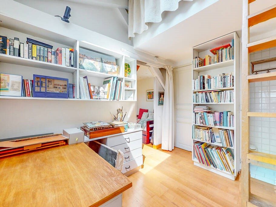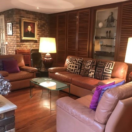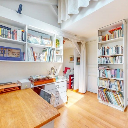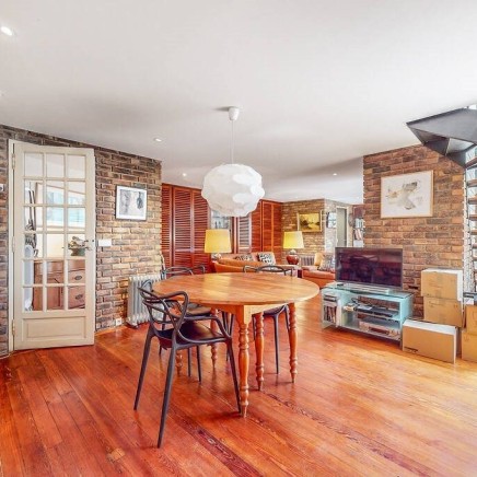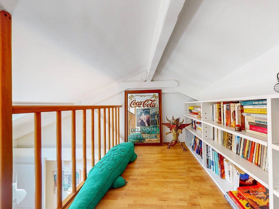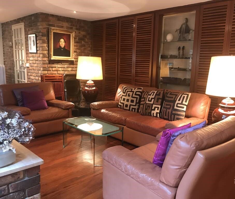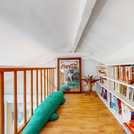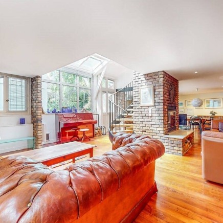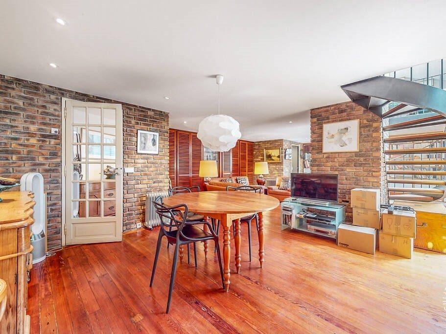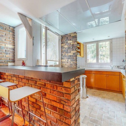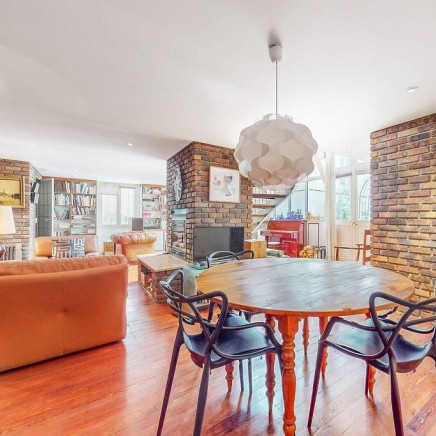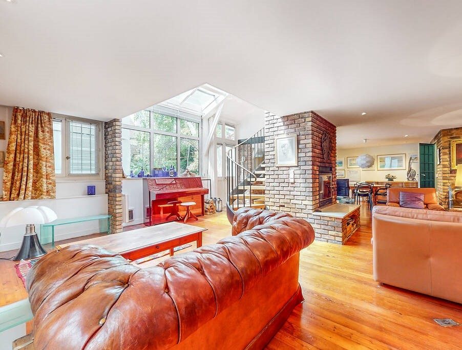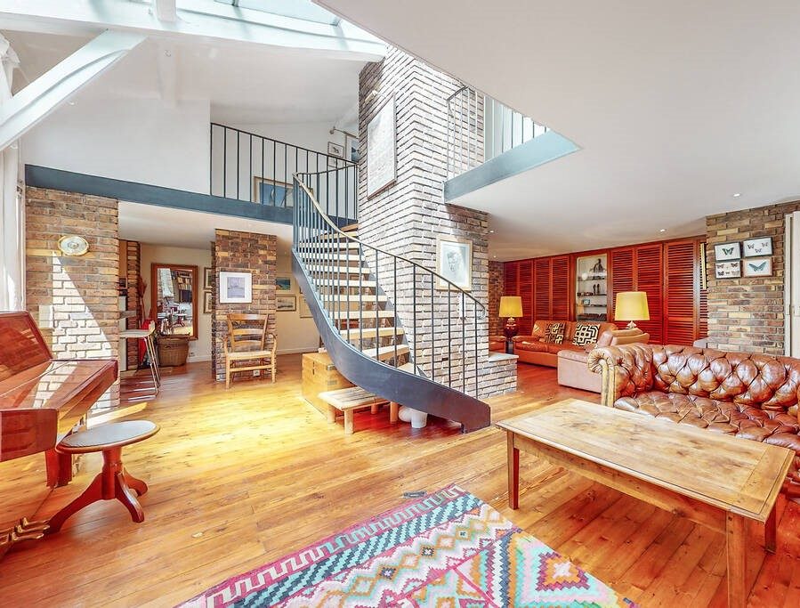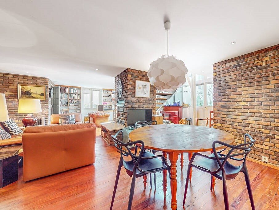 Parquet, verrière, volumes, cheminée centrale, briques apparentes et de nombreux rangements font de cette pièce un véritable cocon.