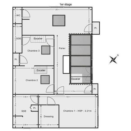 - À l'étage : le palier dessert un espace bureau/bibliothèque en mezzanine baigné de lumière, une suite parentale avec salle de bains (baignoire et douche) et dressing, deux chambres avec mezzanine commune. WC.