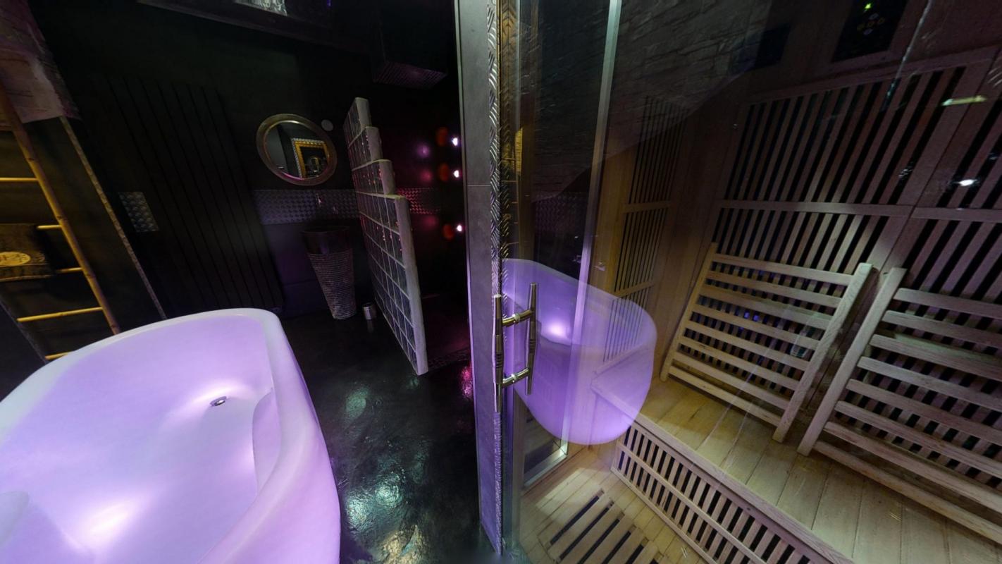 2 planchers de verre laissent apparaître au Sous/sol une grande salle de musculation (possible de la transformer en 2ème chambre, plan déjà prévu), avec son tapis de course professionnel, une grande douche à l'italienne, un sauna et une baignoire lumineuse.