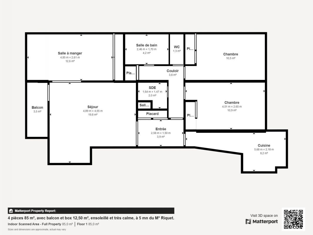 Actuellement grand double-salon ensoleillé avec balcon, de 35 m² (salon 21,33 m² + salle à manger 14,56 m² (c'était avant une 3ème chambre indépendante)), 2 chambres de 11,90 m² et 11,88 m², avec placards intégrés, une grande cuisine indépendante (9,52 m²) avec fenêtre, 2 salles de bains (une avec douche), un WC indépendant, et de nombreux placards intégrés dans toutes les pièces et à l'entrée (4,75 m²).