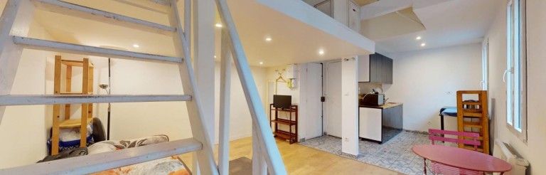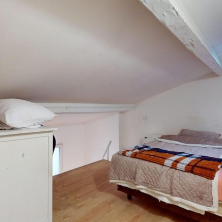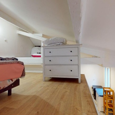 Sur la mezzanine de 14 m² au sol (2,80 m² en loi Carrez), vous trouverez un grand lit avec velux au-dessus ainsi qu'un bel espace de rangement.