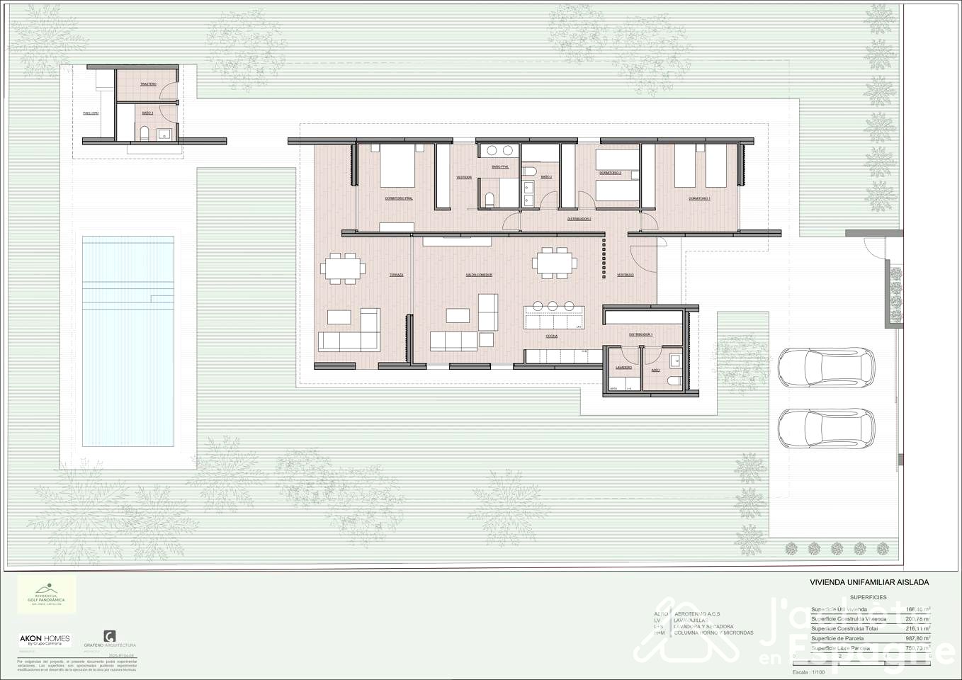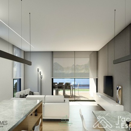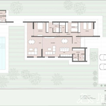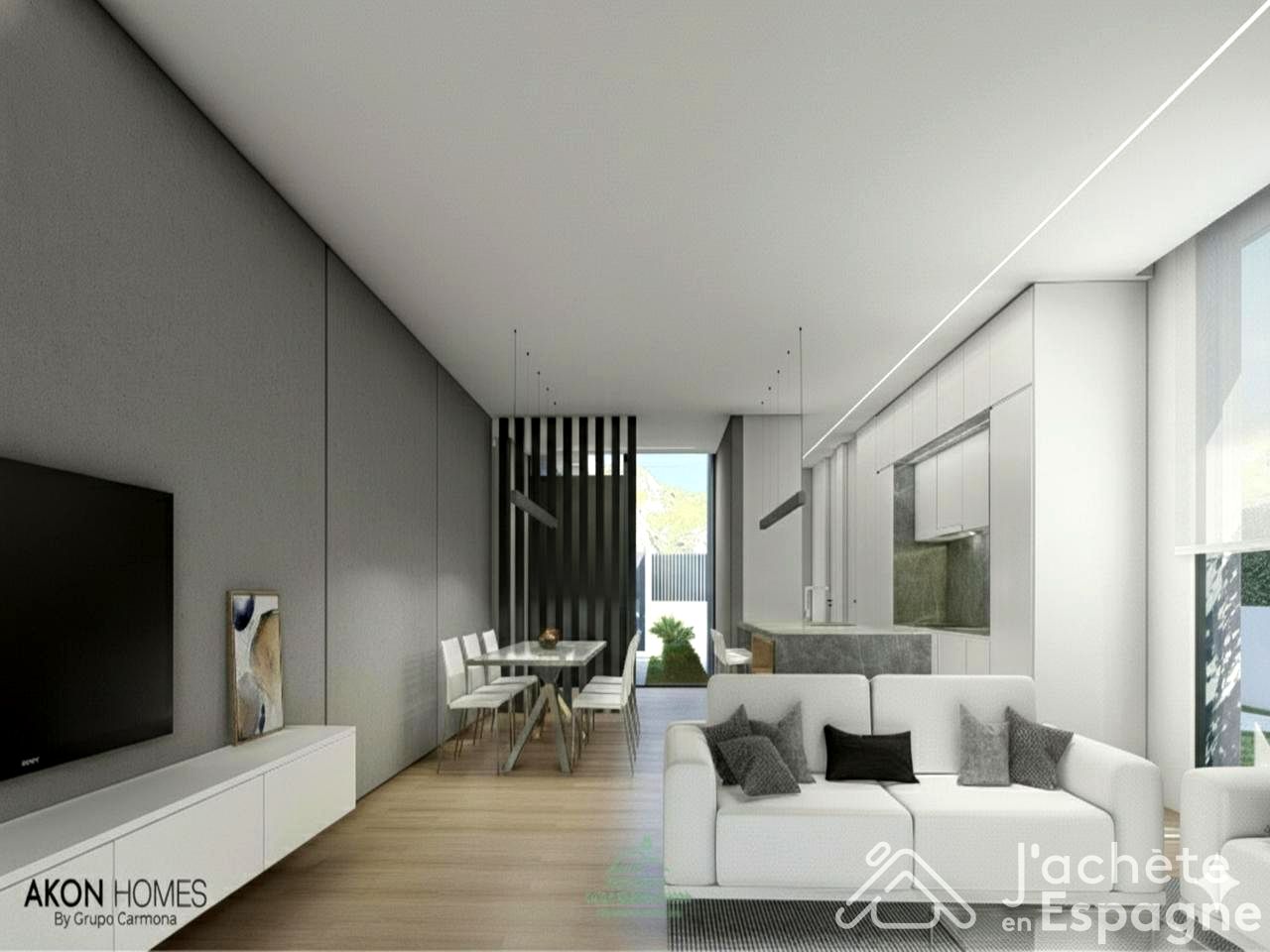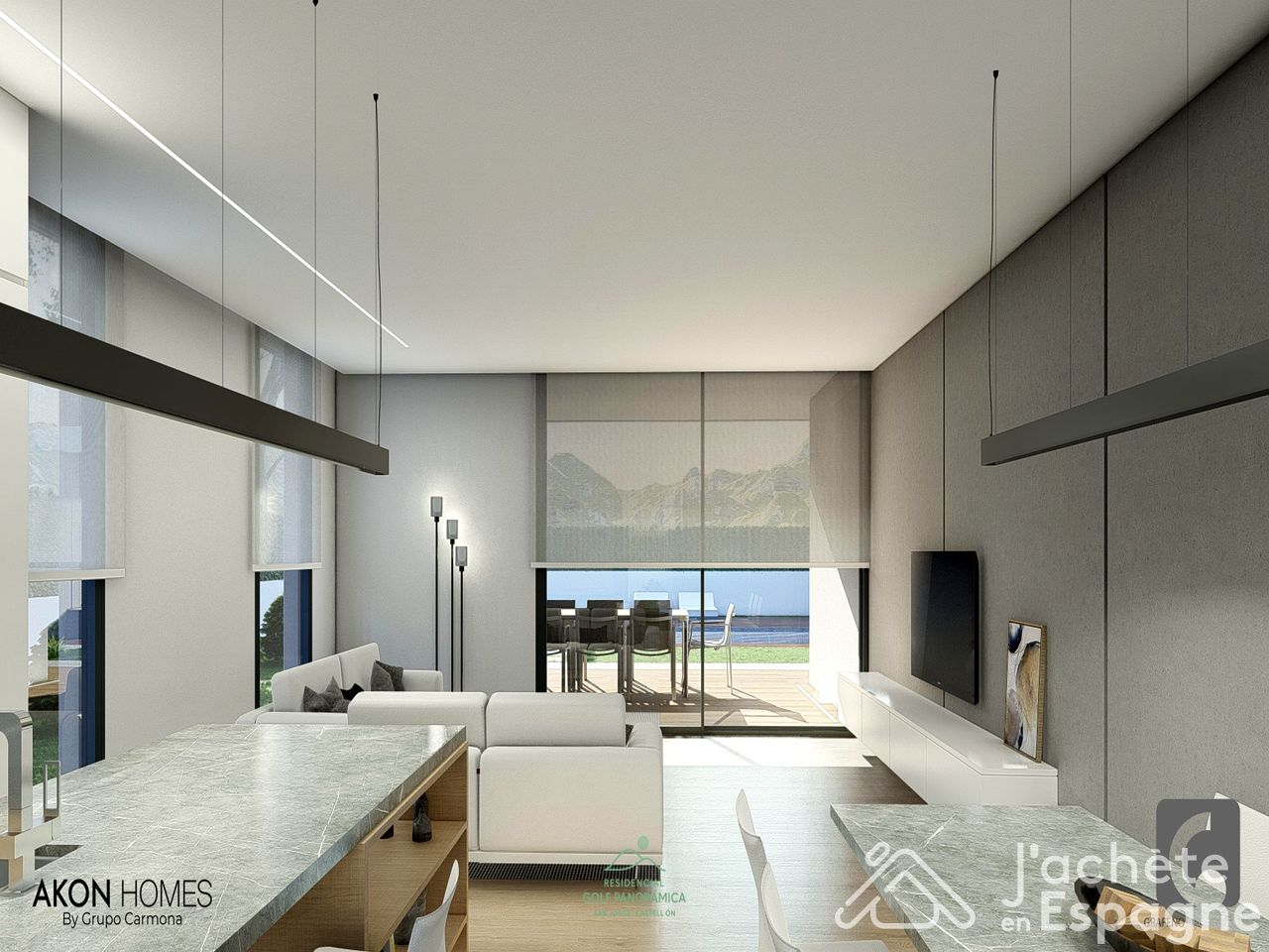 Conçue de plain-pied, elle allie une architecture moderne et fonctionnelle à des matériaux haut de gamme, où la lumière naturelle et la connexion avec l'extérieur sont mises en valeur. Le salon, la salle à manger et la cuisine s'ouvrent entièrement sur le jardin privé avec piscine, créant un espace idéal pour profiter du climat méditerranéen tout au long de l'année.