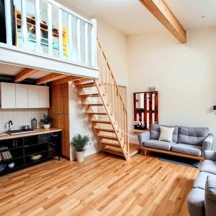 A l'étage, une spacieuse mezzanine accueille l'espace nuit et un coin dressing. Deux Velux assurent une lumière traversante et renforcent la sensation d'espace sous plafond.