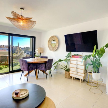 Sète ? Corniche. Dans la dernière résidence contemporaine du quartier, cet appartement conjugue élégance, confort et douceur de vivre. Situé en étage élevé avec ascenseur, il bénéficie d'un emplacement recherché, à seulement dix minutes à pied des commerces de la Corniche et à 700 mètres des plages. L'accès au quartier de la Corniche se fait aisément et en toute sécurité par le chemin des Carrières. Les écoles se trouvent à deux pas, tout comme le club de tennis du Mas Viel, à moins de 500 mètres.