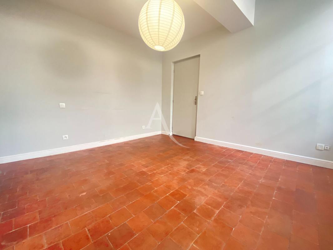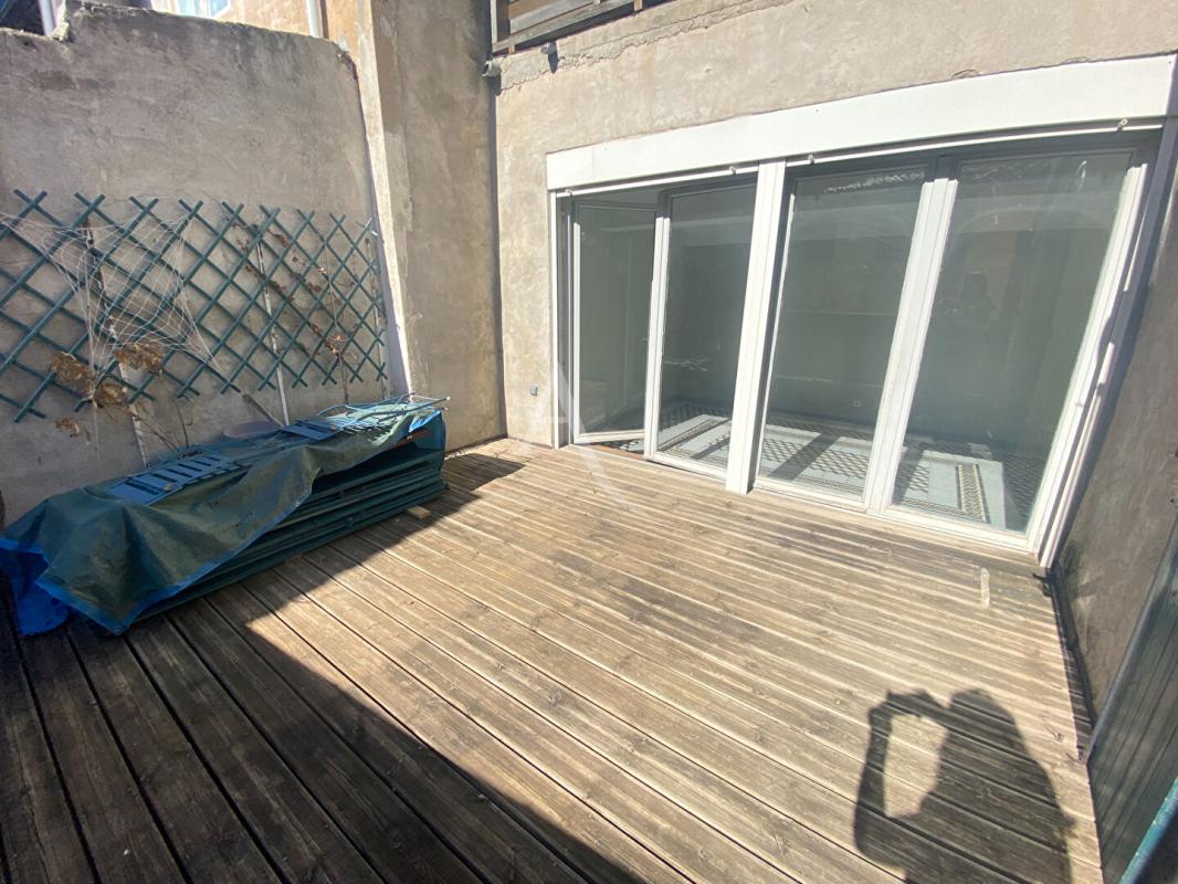 Un premier dégagement dessert la cuisine séparée équipée d'une hotte et d'une plaque de cuisson ainsi qu'un salon lumineux ouvrant tous deux sur une spacieuse terrasse ensoleillée, sans vis-à-vis.