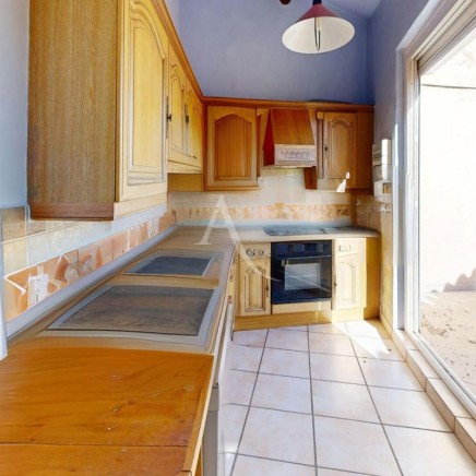 Une pièce de vie lumineuse avec cuisine ouverte, créant un espace convivial et chaleureux avec accès direct à une terrasse ensoleillée