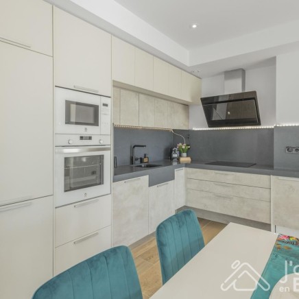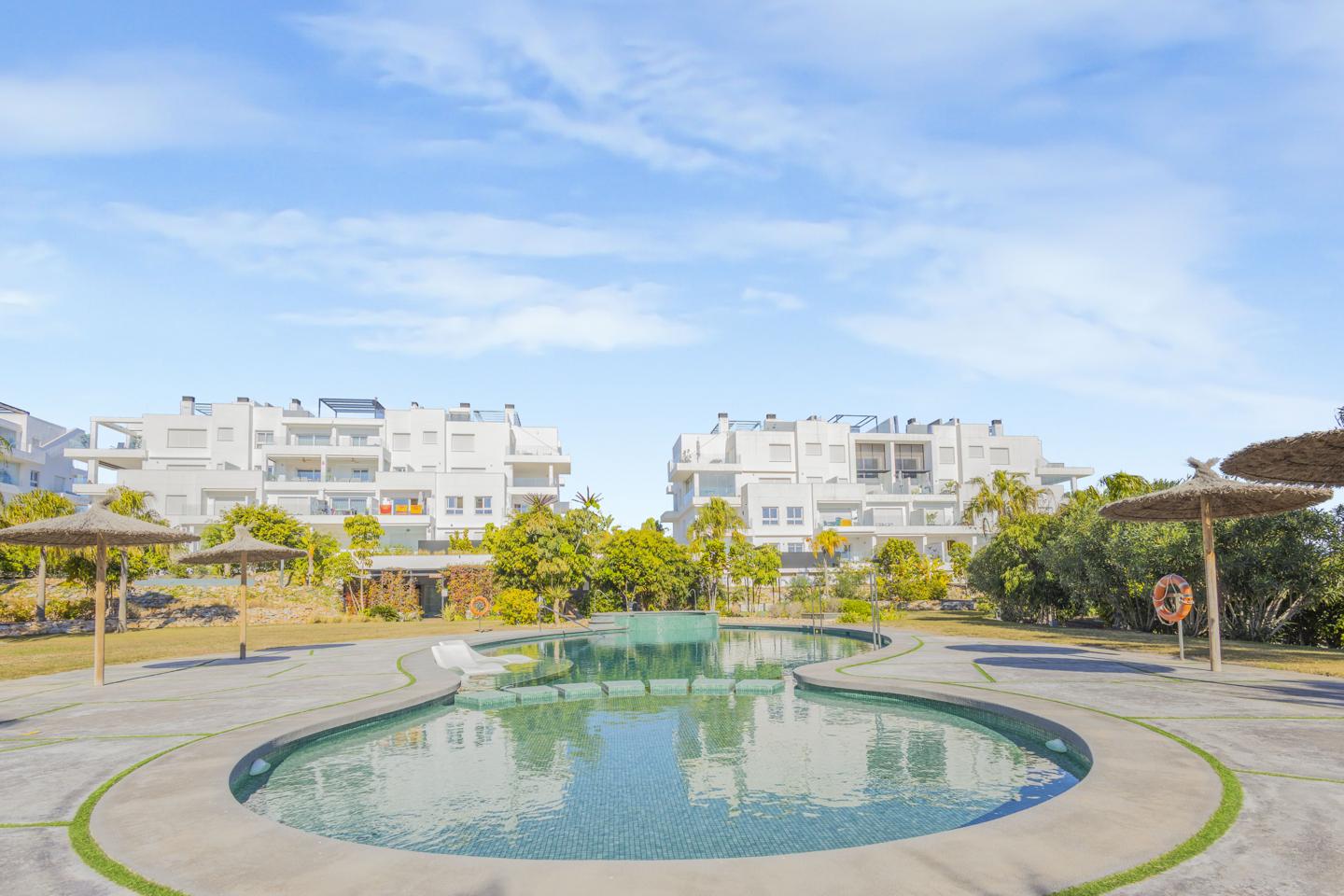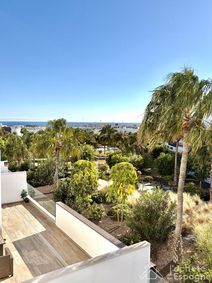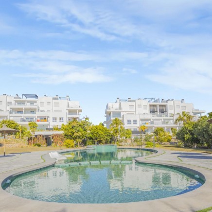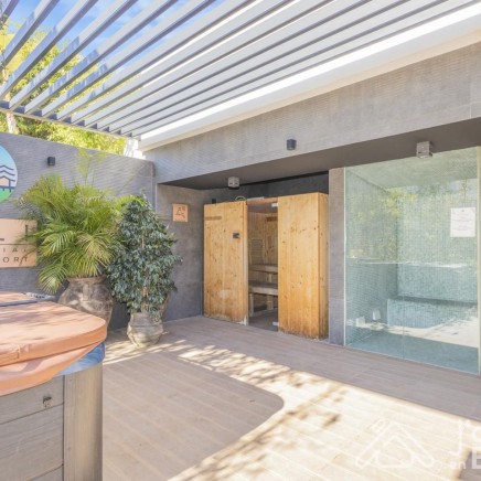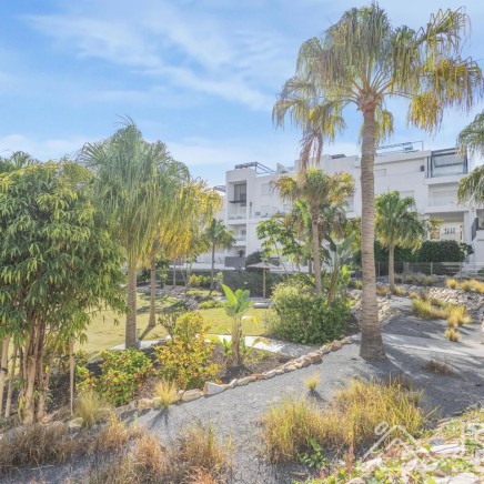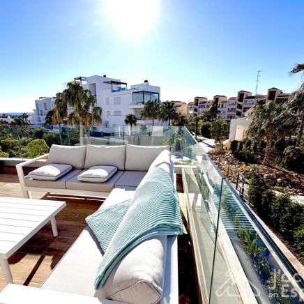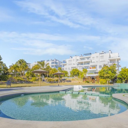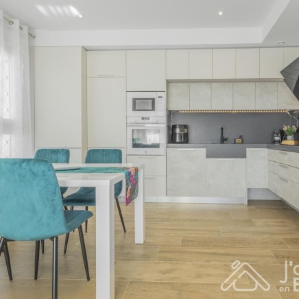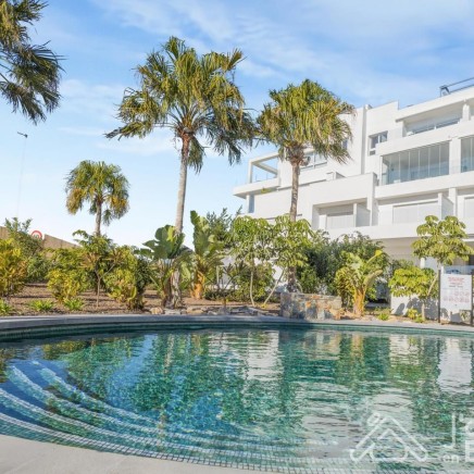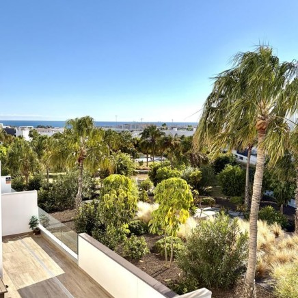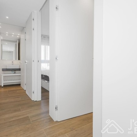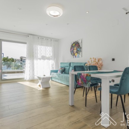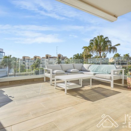 El salón-comedor con cocina abierta se abre a una gran terraza ideal para comer al aire libre, tomar el sol o relajarse, con preciosas vistas a las piscinas y al mar. Además, uno de los dormitorios dispone de una terraza privada más pequeña, perfecta como rincón íntimo para leer o tomar un café.